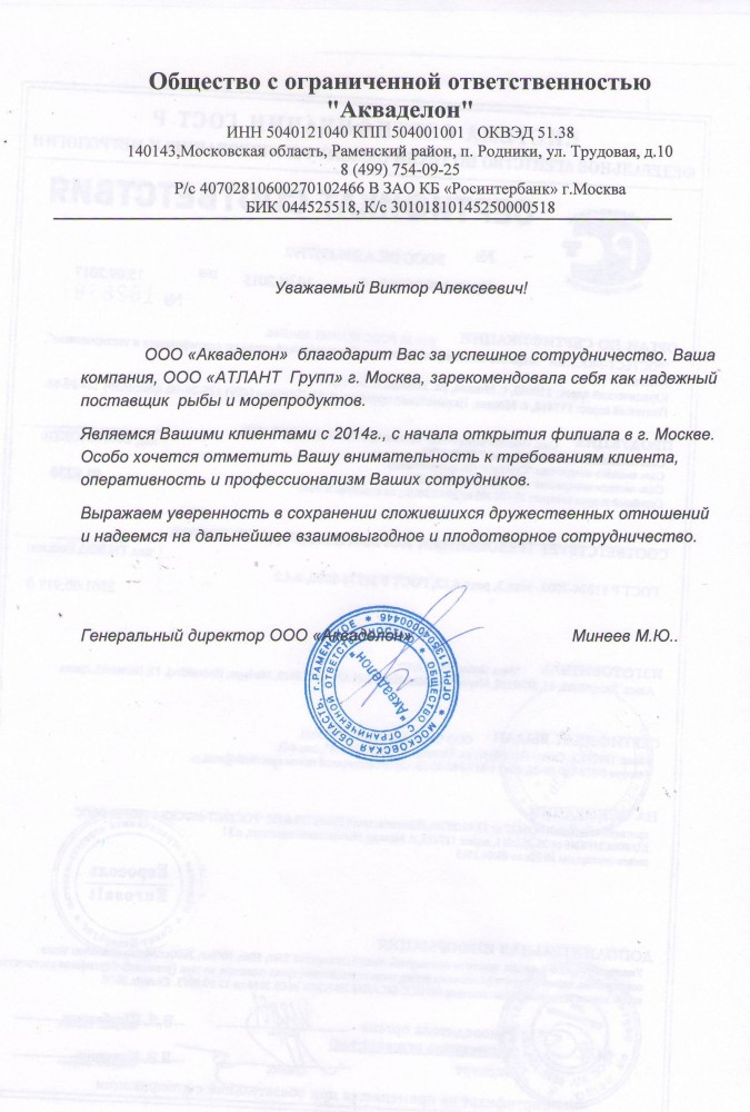 ООО "Акваделон" благодарит Вас за успешное сотрудничество. Компания Атлант г.Москва, зарекомендовала себя как надежный поставщик рыбы и морепродуктов.