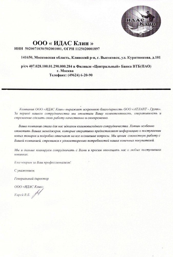 Компания ООО "ИДАС Клин" выражает искреннюю благодарность компании АТЛАНТ.